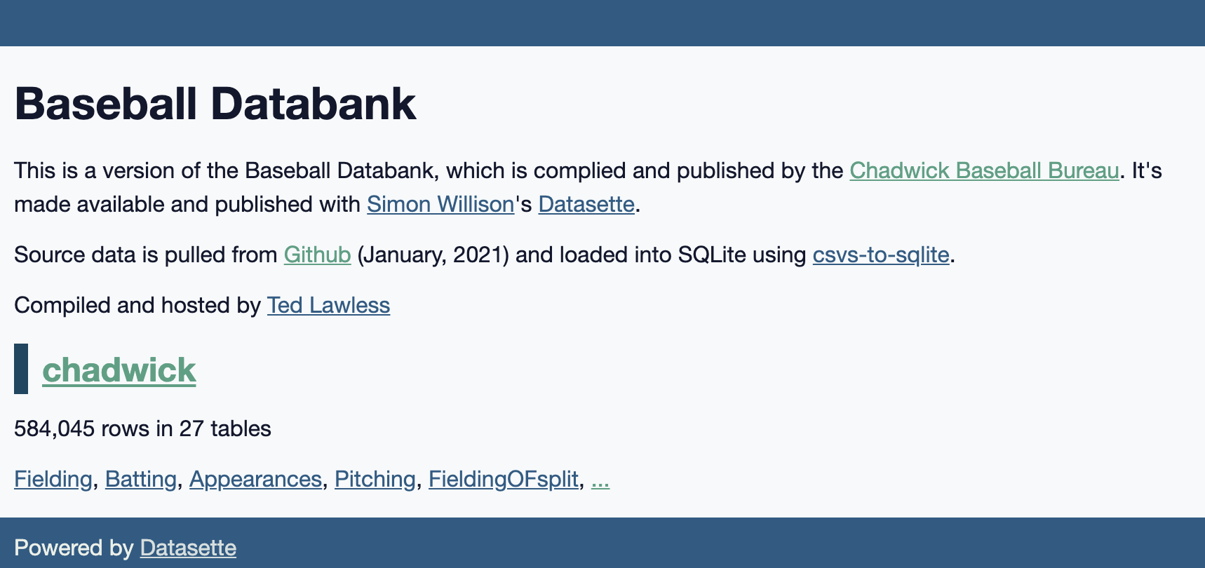 위의 스크린샷 속 데이터베이스는 앞으로 다루게 될 오픈소스 데이터베이스로서 미국 최대 야구리그인 메이저리그(MLB) 내 선수 정보를 담은 데이터베이스입니다.