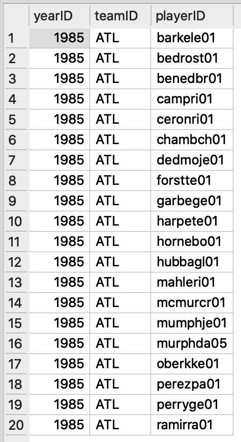 이번에는 같은 Table에서 연도, 팀, 선수ID 데이터만 출력하는 구문으로 응용해 보겠습니다.