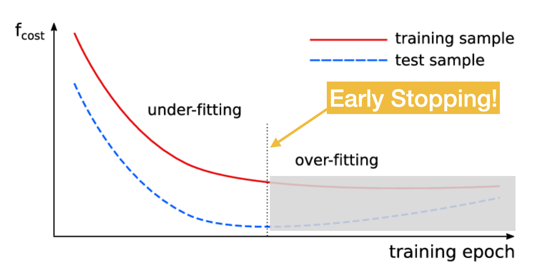 그렇다면 모델 적합의 최적점(optimum)은 어디일까요? 바로 과소적합과 과대적합이 발생하기 전후의 사이 구간에 최적의 포인트가 존재합니다. 쉽게 말해, validation loss가 감소하다가 증가하기 시작하기 직전의 포인트가 모델의 성능이 가장 우수할 가능성(i.e., best fit)이 높다고 말할 수 있습니다.