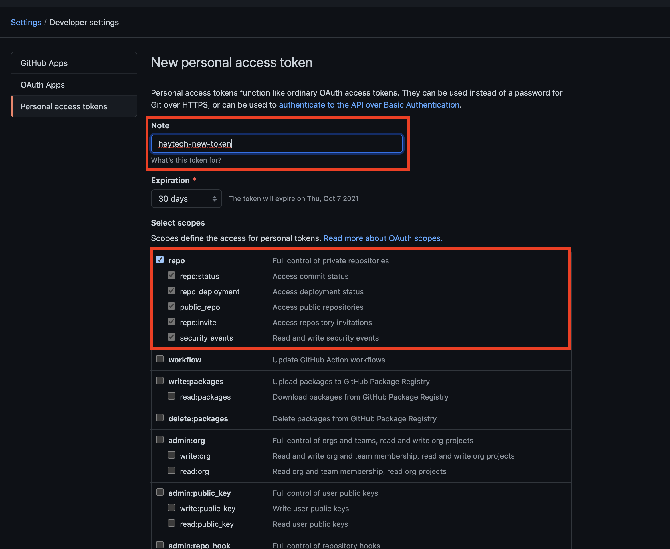 먼저, 토큰 이름을 입력해 주시고, 커맨드 라인을 통해 repository에 액세스 하길 원하신다면 repo에 체크해 주세요! ✅