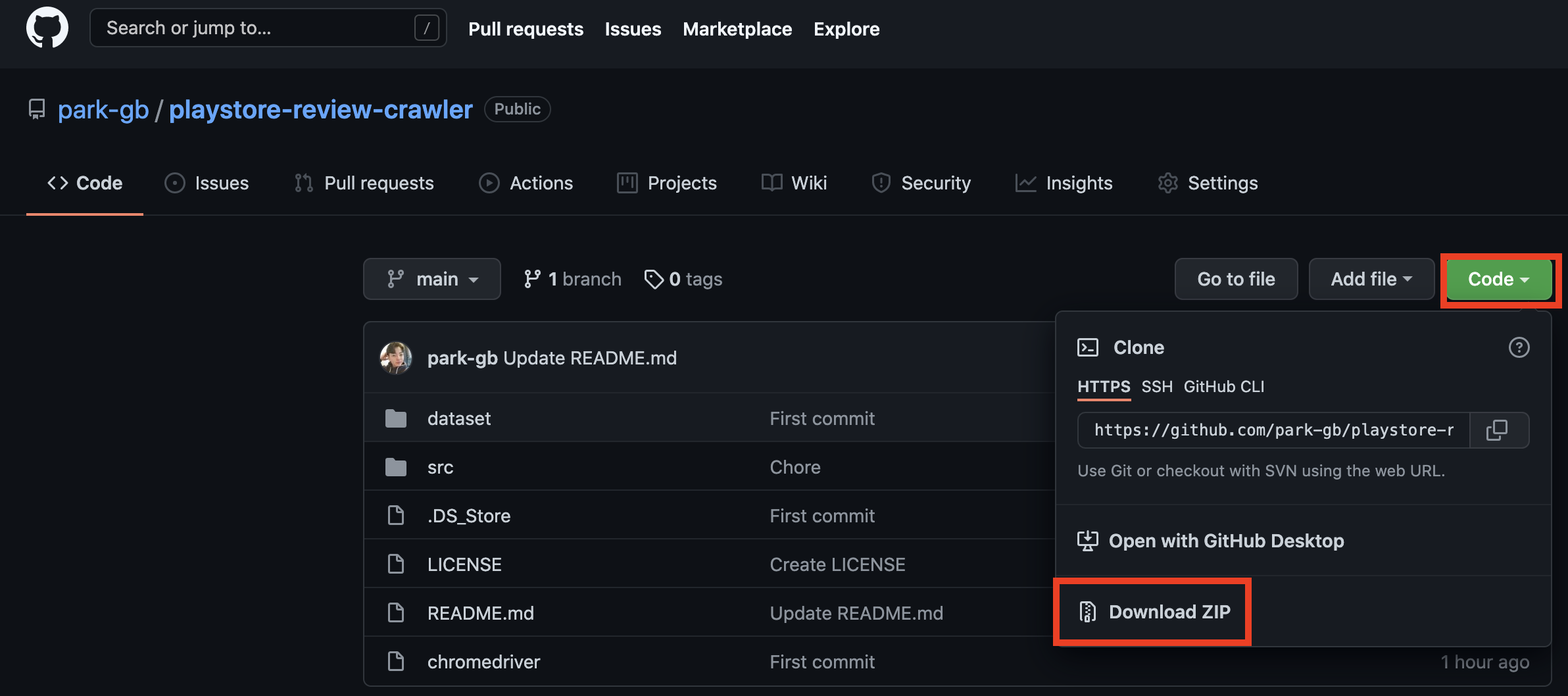 2) 'Download ZIP' 클릭(git이 설치되어 있으신 분들은 clone 하셔도 됩니다)