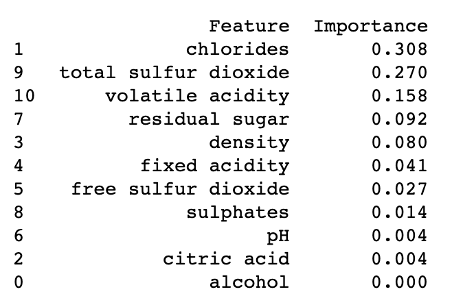변수별 중요도를 산출하면 그림 17그림 18과 같습니다. chlorides(염화물), total sulfur dioxide(총 이산화황), volatile acidity(휘발성산), density(밀도)가 와인 분류 시 가장 중요한 Top 4임을 확인하실 수 있습니다.