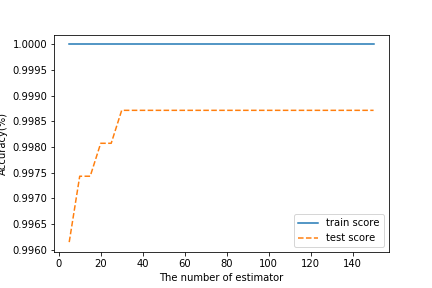 트리 개수에 따른 학습 데이터 및 테스트 데이터에서의 모델 성능은 아래 그림 8과 같습니다. 학습 데이터 기반 모델 정확도가 여전히 100%인 것으로 보아 과적합이 발생한 것으로 보입니다.