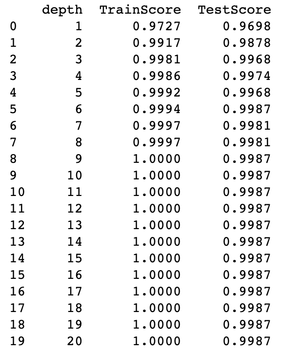 최대 깊이는 적을수록 과적합 방지에 유리합니다. 따라서 최대 깊이는 적고 학습 데이터 기반 모델 정확도와 테스트 데이터 기반 모델 정확도의 차이가 적은 값으로 선정하는 것이 좋습니다. 아래 그림 11과 같이 최대 깊이 값에 따른 모델 성능 추이를 데이터프레임 형태로 출력해 봤습니다.