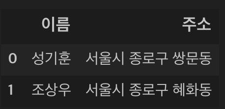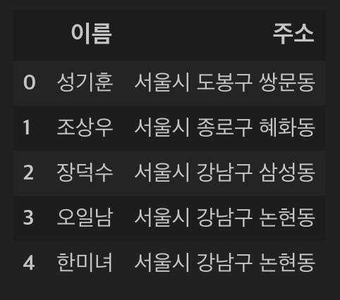 위의 데이터프레임 예시처럼 주소 정보가 주어질 때, 특정 구나 동에 거주하는 사람들만 조회하고 싶다면 어떻게 해야 할까요? 이럴 때 사용하는것이 데이터프레임의 내장 함수인 str.contains()입니다. 사용방법을 예시와 함께 살펴보죠.