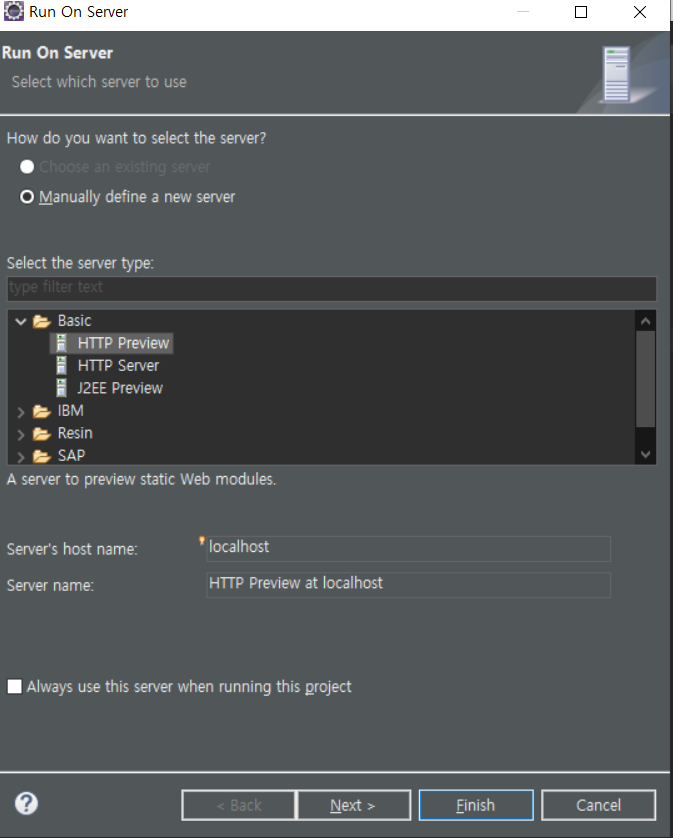 ์๋์ ์คํฌ๋ฆฐ์ท์ฒ๋ผ, Basic์ ์๋ HTTP Preview๋ฅผ ํด๋ฆญํฉ๋๋ค. HTTP Preview๋ ์ดํด๋ฆฝ์ค์ ๊ธฐ๋ณธ์ ์ธ ๋ด์ฅ ์๋ฒ์ ๋๋ค. Finish ๋ฒํผ์ ํด๋ฆญํฉ๋๋ค.