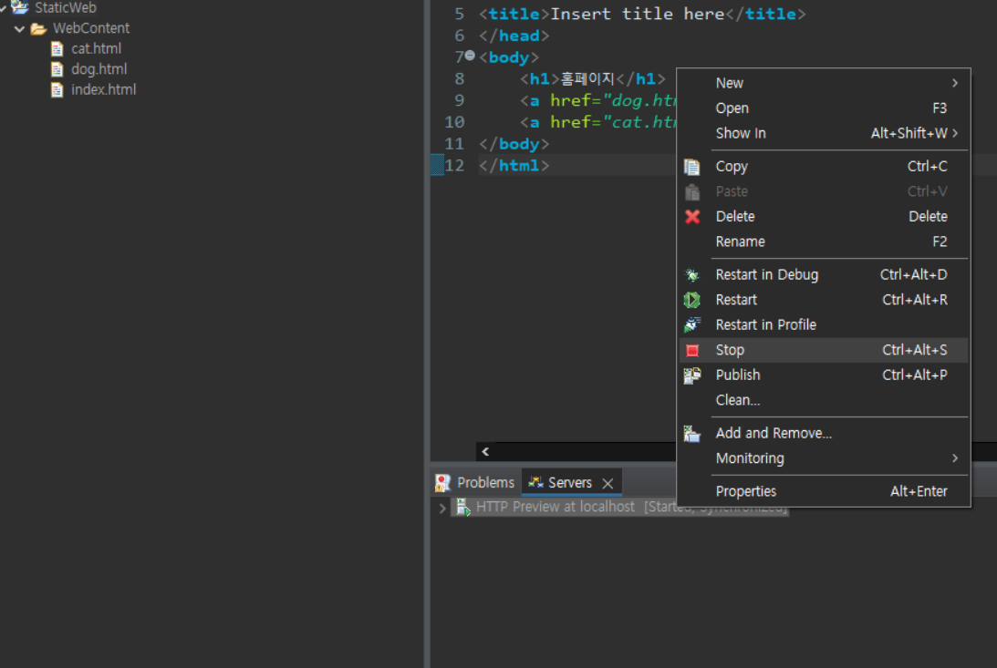 ์๋ฒ๋ฅผ ์ข ๋ฃํ๊ณ ์ถ์ผ์๋ฉด ์ดํด๋ฆฝ์ค ๋ด ํ๋จ์ Servers ํญ ๋ง์ฐ์ค ์ฐ์ธก ํด๋ฆญ > Stop ๋ฒํผ์ ํด๋ฆญํด ์ค๋๋ค.