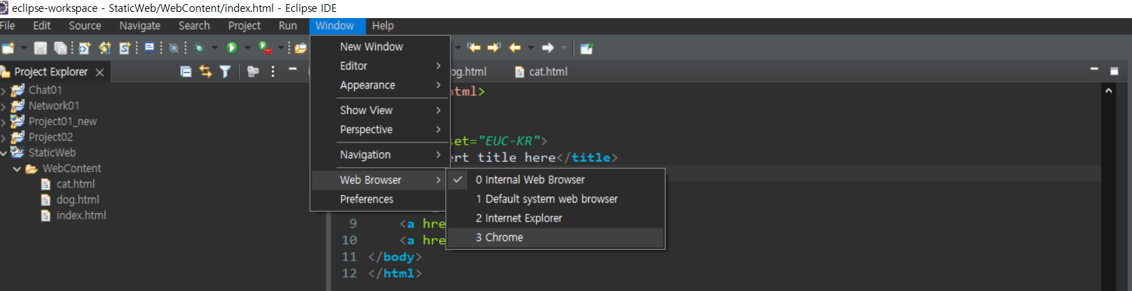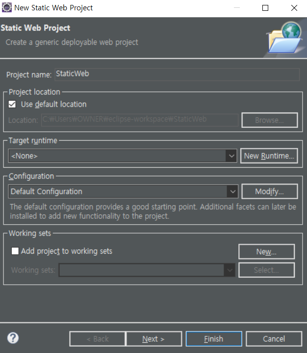 ์๋จ ๋ฉ๋ด๋ฐ์์ File > New > Static Web Project์ ์ฐจ๋ก๋ก ํด๋ฆญํ์ฌ ์ ์ ์ธ ์น ํ๋ก์ ํธ๋ฅผ ์์ฑํฉ๋๋ค.