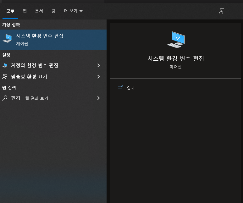 ํค๋ณด๋์ ์๋์ฐ ํค๋ฅผ ๋๋ฅด์๊ณ "ํ๊ฒฝ" ์ ๋๋ง ์ ๋ ฅํ์๋ฉด, "์์คํ ํ๊ฒฝ ๋ณ์ ํธ์ง"์ด ๋์ค๊ณ ์ด๊ฑธ ์ด์ด์ค๋๋ค.