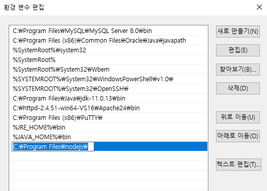 nodejs์ ํ๊ฒฝ๋ณ์๊ฐ ์ ์ถ๊ฐ๋์ด ์๋์ง ํ์ธํฉ๋๋ค. ์ถ๊ฐ๋์ด ์์ง ์๋ค๋ฉด ์ฐ์ธก์ "์๋ก ๋ง๋ค๊ธฐ" ๋ฒํผ์ ํด๋ฆญํ๊ณ nodejs ์ค์น ๊ฒฝ๋ก๋ฅผ ์ ๋ ฅํฉ๋๋ค. ํ๋ก๊ทธ๋จ ์ค์น ์ ๊ฒฝ๋ก ์์ ์ ์ ํ๋ค๋ฉด ์๋ง ์๋ ๊ฒฝ๋ก์ ์ค์น๋์ด ์์ ๊ฒ๋๋ค.