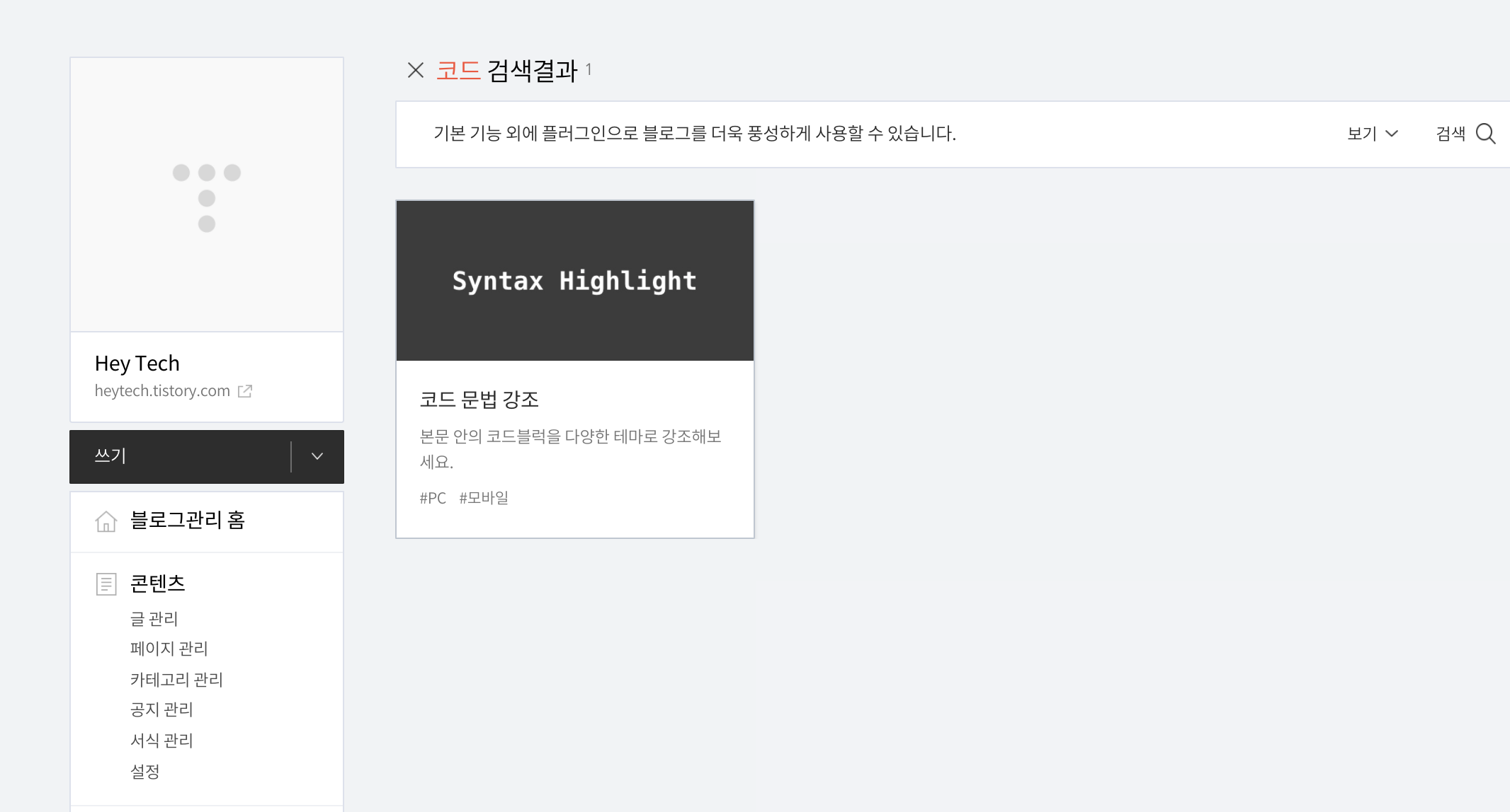 플러그인 내 "코드"만 검색하시면 "코드 문법 강조"라는 플러그인이 나옵니다.