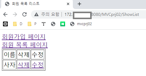 ์๋์ ๊ฐ์ด ShowList.jsp๋ก ํ์ด์ง๊ฐ ์ ํ๋๋ฉฐ ํ์ ๋ฐ์ดํฐ๊ฐ ์ ์กฐํ๋ ๊ฒ์ ํ์ธํ ์ ์์ต๋๋ค.