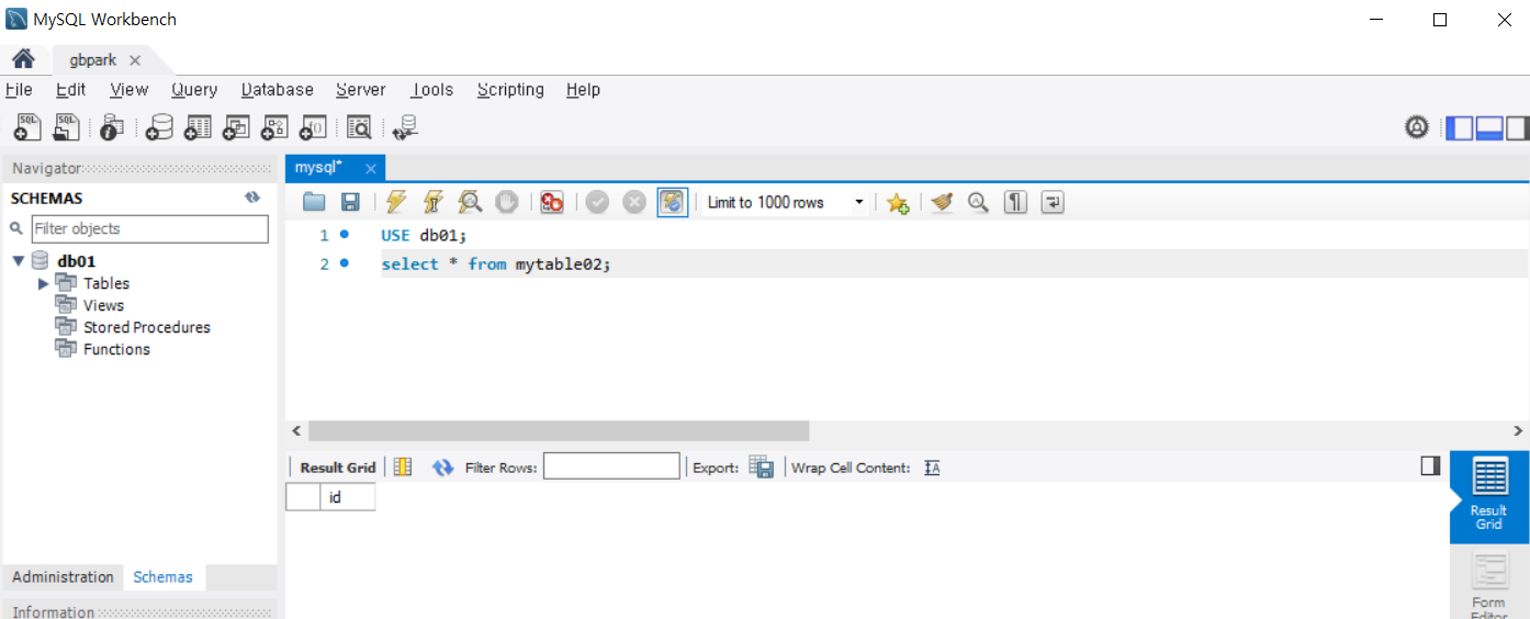 ๊ฐ์ ๋จธ์ ์์ ์์ฑํ ๋ฐ์ดํฐ๋ฒ ์ด์ค db01 ๋ด mytable02 ํ ์ด๋ธ์ ์กฐํํด ๋ด ๋๋ค.