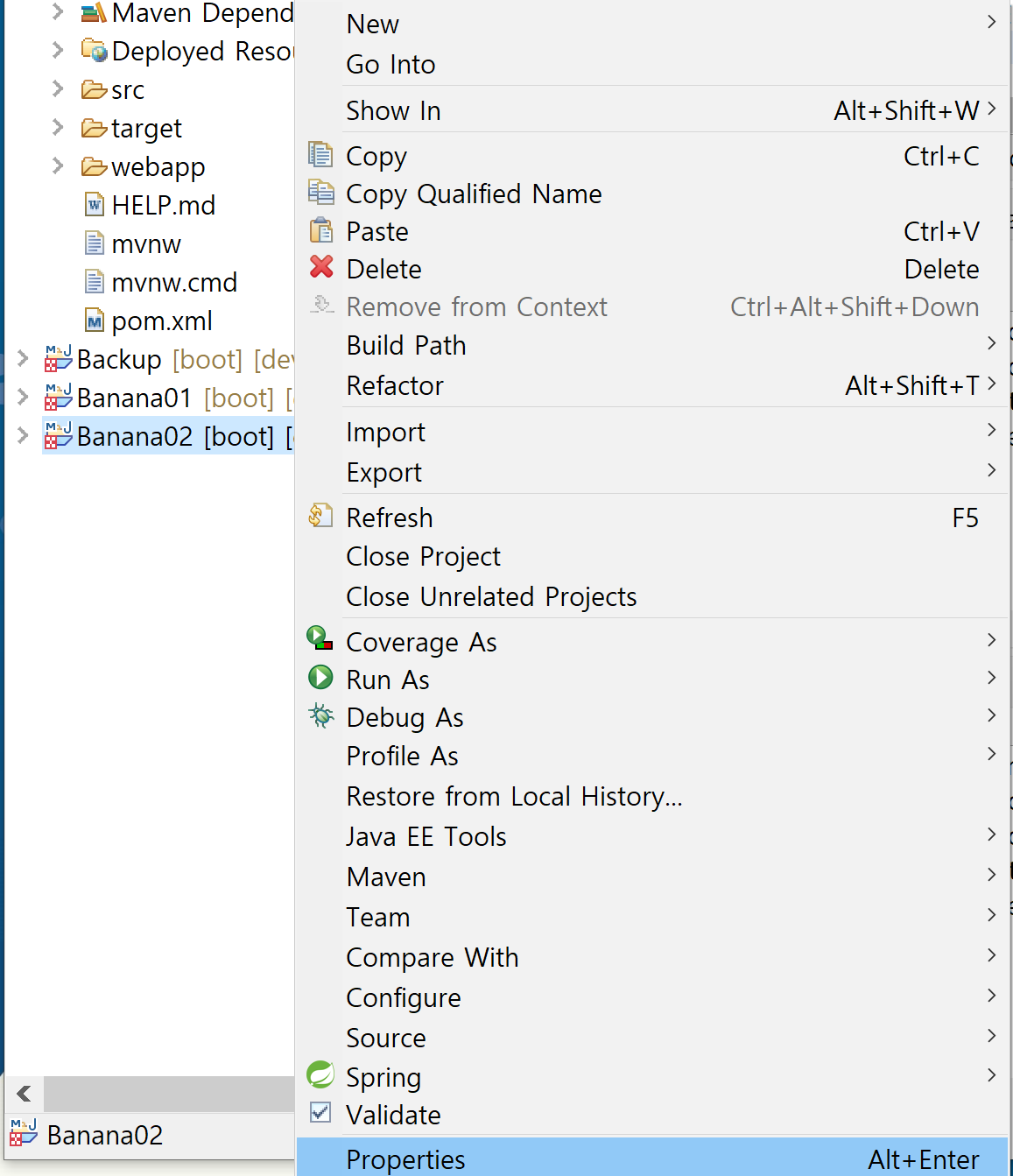 프로젝트 이름 우측 클릭 후 Properties 클릭합니다.
