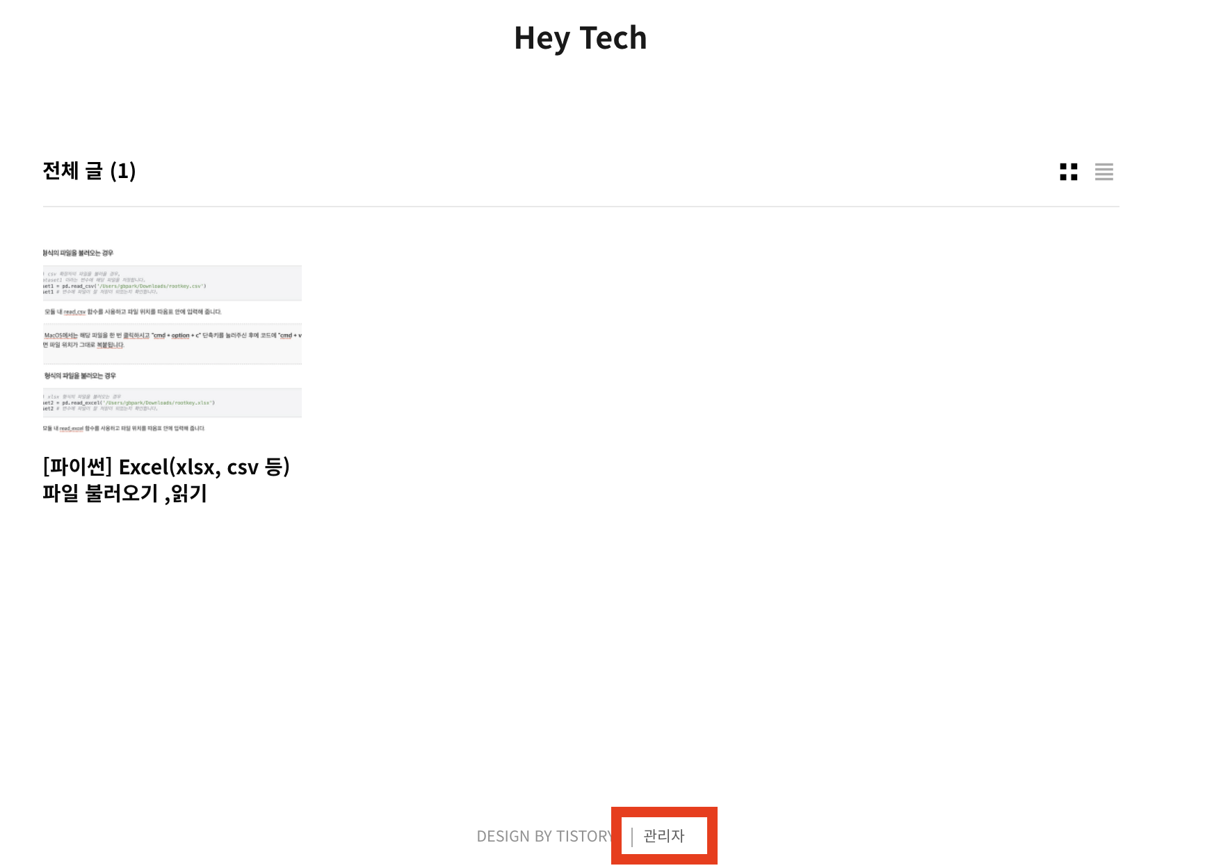 블로그 홈페이지 중앙 하단에 "관리자" 버튼을 클릭합니다.