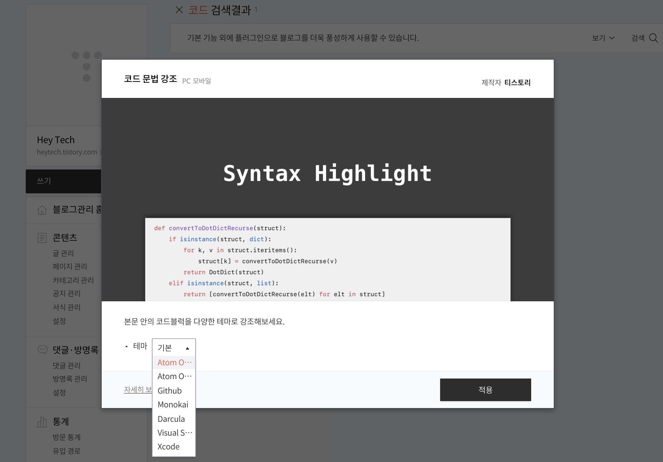 글 작성 시 코드 블록이 프로그래밍 언어 특성에 맞게 테마가 자동으로 적용된 것을 봤습니다.