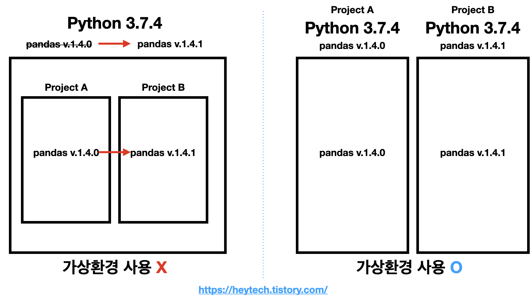그런데 B 프로젝트에서 상위 버전을 사용하기 위해 pandas 1.4.1을 설치했다면 어떻게 될까요? 이제 파이썬 3.7.4 버전의 모든 프로젝트는 pandas 패키지 버전이 1.4.1이 되겠죠. 이 상태에서 A 프로젝트를 진행하면 에러가 발생할 수 있습니다. 이러한 문제를 방지하기 위해 가상 환경을 사용하는 것이죠.