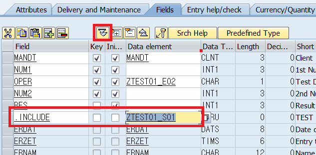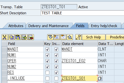 필드명에 .INCLUDE를 입력하고, Data Element에 생성했던 구조체 이름을 입력합니다.