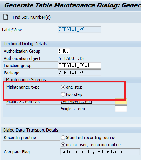 Maintenance Screens 탭에서 Maintence Type은 데이터 추가, 조회, 수정, 삭제(CRUD)를 수행하는 Table Maintenance Program 화면의 단계(step) 수를 의미합니다. 즉, Maintence Type을 One step로 선택할 경우, 하나의 화면에서 데이터 조회와 수정 등이 가능합니다. 반면, Two step으로 선택할 경우, 화면을 총 두 단계로 구성하여 데이터를 조회하는 화면과 데이터를 조작하는 화면을 따로 만듭니다.