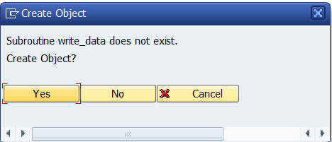 FORM 구문 생성하는 방법은 2가지입니다. 첫째, 직접 스크립트를 입력하는 방법입니다. Step 3을 Skip하시고 Step 4를 참고하시면 됩니다. 두 번째 방법은 GUI 기반 생성방법입니다. 구문 이름에 마우스 커서를 올리고 마우스 왼쪽 버튼을 더블클릭합니다. 아래와 같이 해당 구문은 현재 Subroutine으로 존재하지 않고 있기 때문에 객체로 만들 것인지 묻는 팝업창이 나옵니다. Yes를 클릭합니다.