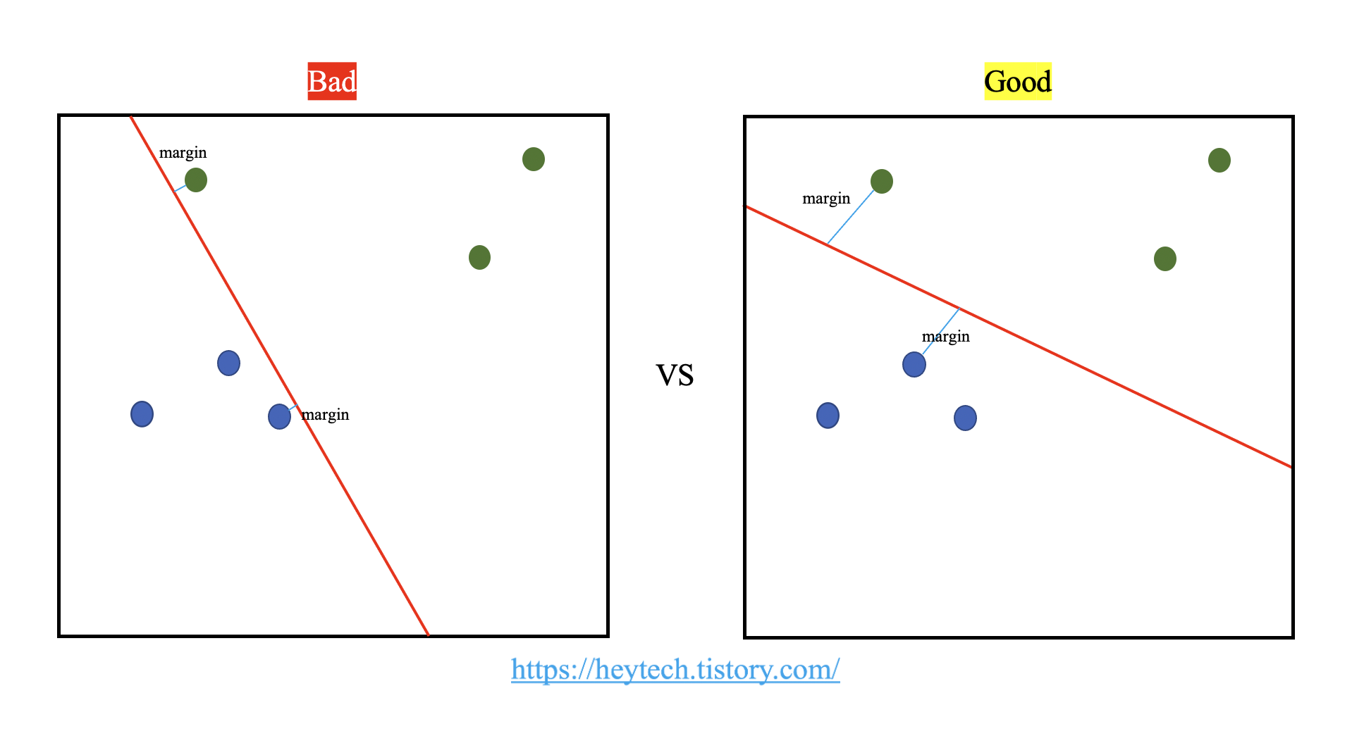 Sign 함수는 데이터와 결정경계(Decision Boundary) 간 거리 정보를 고려하지 않는 한계가 존재합니다. 그 이유에 대해 자세히 알아봅니다. 아래의 그림 3과 같이, 녹색과 파란색 동그라미 클래스가 있다고 가정해 보겠습니다. 두 클래스를 분류하는 기준이 되는 선을 결정경계(Decision Boundary)라고 부릅니다. 그림 3에서는 빨간색 직선이 이에 해당합니다. 그렇다면 좌측 그림과 우측 그림에서 어떤 결정경계가 더 좋다고 말할 수 있을까요?