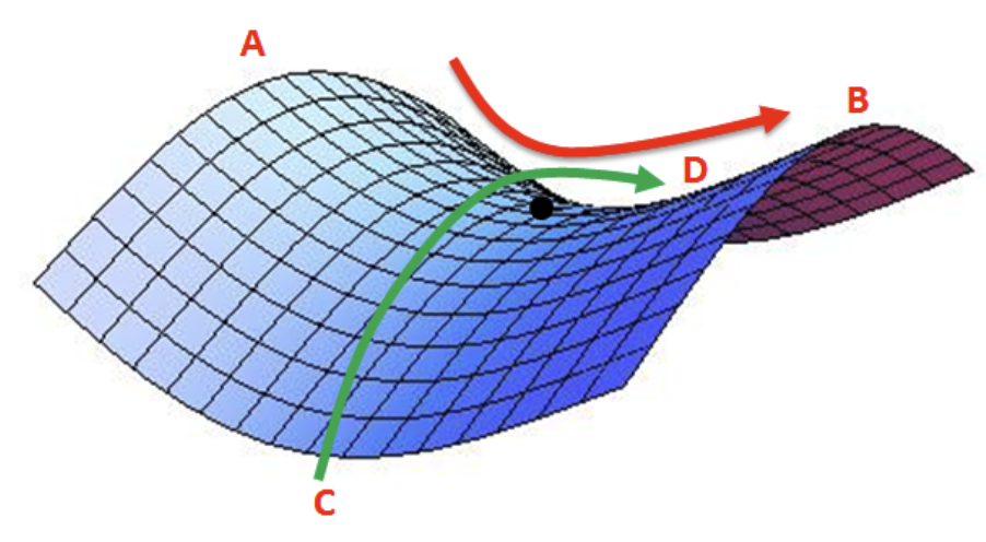 경사 하강법의 두 번째 한계점은 안장점(Saddle Point)을 벗어나지 못한다는 것입니다. 아래의 그림 6에 검정색 점이 안장점입니다. 말(horse)의 안장과 비슷한 모양 위에 있는 점이라 안장점이라고 이름 붙여졌다고 합니다. 안장점은 기울기가 \(0\)이지만 극값이 아닌 지점을 의미합니다. 아래 그림 6과 같이, A-B 사이에서 검은색 점은 최솟값(minima)이지만, C-D 사이에서 검은색 점은 최댓값(maxima)입니다. 따라서 해당 지점은 미분이 \(0\)이지만 극값을 가질 수 없습니다. 경사 하강법은 미분이 \(0\)일 경우 더이상 파라미터를 업데이트하지 않기 때문에, 이러한 안장점을 벗어나지 못하는 한계가 있습니다.