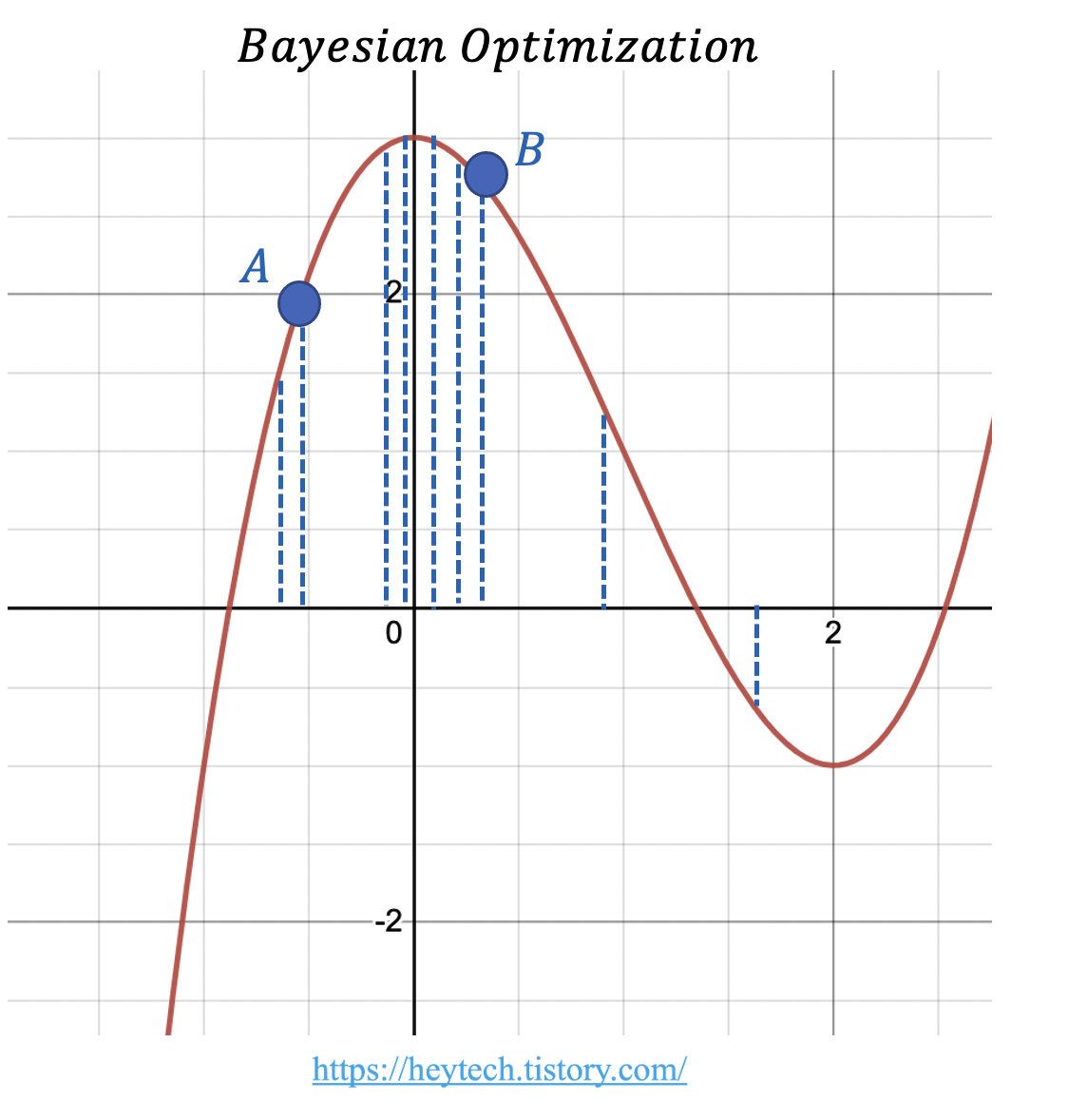 베이지안 최적화(Bayesian Optimization)는 최적의 해 근처의 하이퍼파라미터를 위주로 탐색하는 작업과 임의의 새로운 하이퍼파라미터를 탐색하는 과정을 반복하여 최적의 해를 탐색하는 기법입니다. 아래의 그림 3처럼, 초기에 A와 B 위치의 하이퍼파라미터를 탐색했다고 가정해 보겠습니다. 목표함수의 최댓값을 찾는 문제라면, A보다는 B 근처에 최적의 해가 위치할 가능성이 높겠죠. 베이지안 최적화는 이러한 경우를 고려하여 최적의 해가 근처에 있을 가능성이 높은 구간을 위주로 탐색합니다. 더불어, 해당 구간 외에도 최적의 해가 있을 가능성을 열어두고 임의의 새로운 하이퍼파라미터에 대해서도 탐색을 이어 나갑니다.