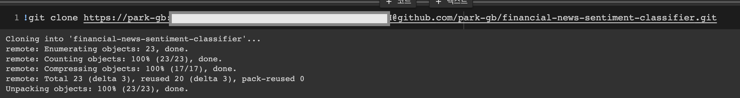 !git clone https://[Github ์์ด๋]:[access token]@github.com/[Github ์์ด๋]/[๋ฆฌํฌ์งํ ๋ฆฌ ์ด๋ฆ].git