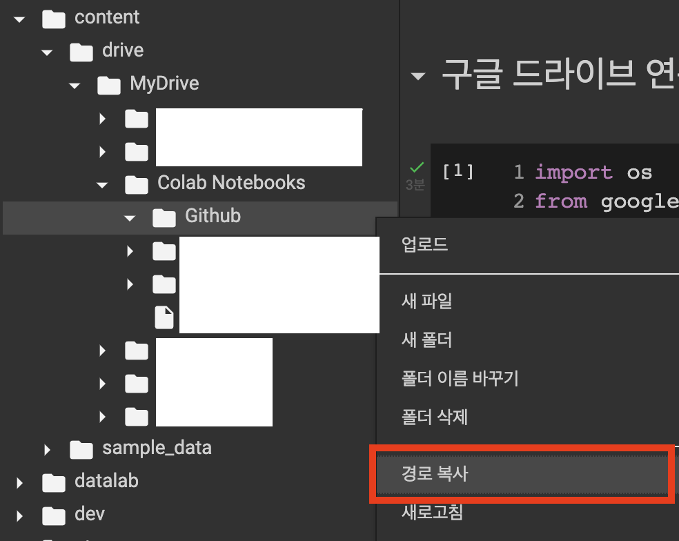์์คํ์ผ์ ๋๋ ํ ๋ฆฌ๋ฅผ ๋ณ๊ฒฝํ๊ธฐ์ ์์, ์์ ์์ฑํ ํด๋์ ๊ฒฝ๋ก๋ฅผ ๋ณต์ฌํฉ๋๋ค. ์ฝ๋ฉ ์ข์ธก์ ํด๋ ๋ชจ์ ์์ด์ฝ์ ํด๋ฆญํ์๊ณ , ๊ตฌ๊ธ ๋๋ผ์ด๋ธ์ ๋ง์ดํธ ๋ ์์น ํ์์ ์์ ์์ฑํ๋ ํด๋๋ฅผ ์ฐพ์์ค๋๋ค. ํด๋น ํด๋ ์ด๋ฆ ์ฐ์ธก์ ์ธ๋ก๋ก ๋ ... ๋ฒํผ์ ํด๋ฆญํ ํ, ์๋ ๊ทธ๋ฆผ 11๊ณผ ๊ฐ์ด ๊ฒฝ๋ก ๋ณต์ฌ ๋ฒํผ์ ํด๋ฆญํด ์ค๋๋ค.