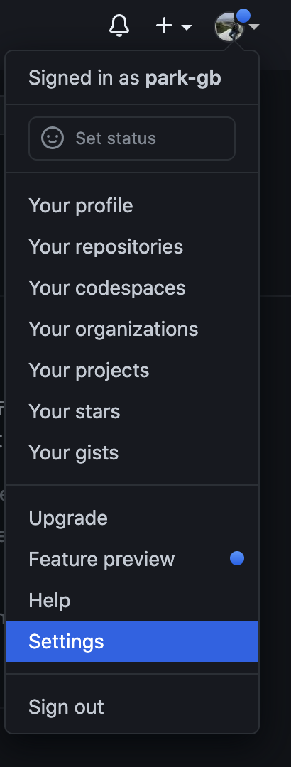์ฐ์ธก ์๋จ ํ๋กํ ํด๋ฆญ - Settings ์์ผ๋ก ํด๋ฆญํฉ๋๋ค(๊ทธ๋ฆผ 2).