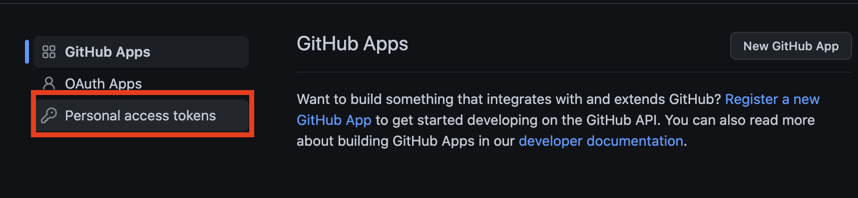 ์ข์ธก์ Personal access tokens๋ฅผ ํด๋ฆญํฉ๋๋ค(๊ทธ๋ฆผ 3).