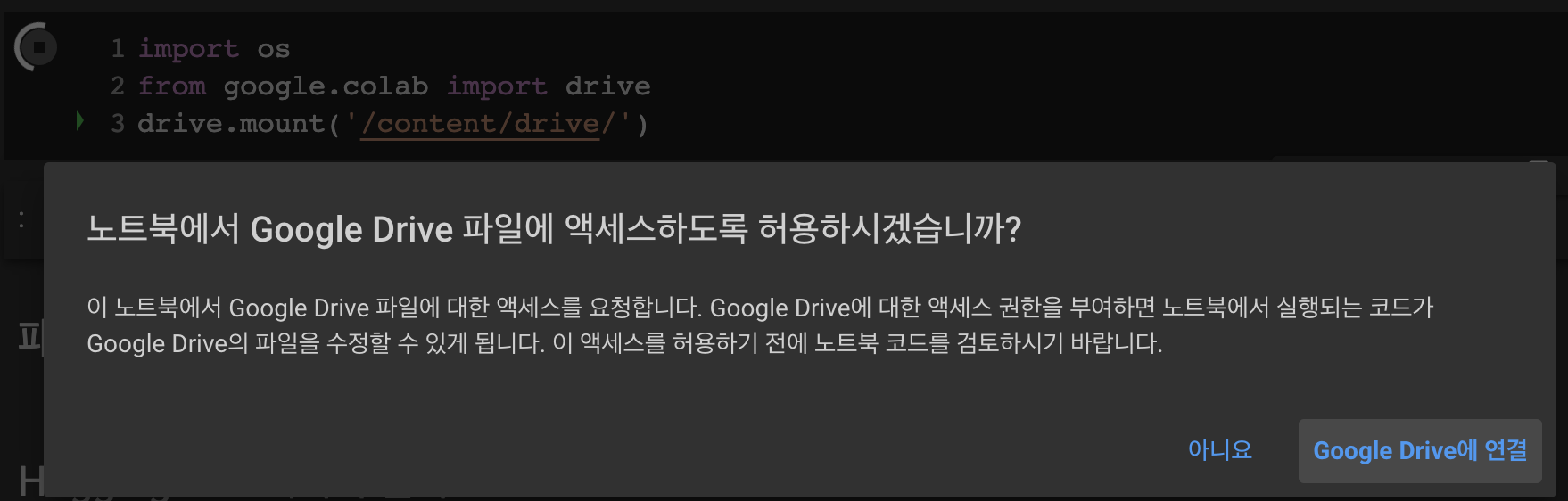 ๋๋ผ์ด๋ธ๋ฅผ ์ฐ๊ฒฐํ ๊ตฌ๊ธ ๊ณ์ ์ ์ ํํ๊ณ ์ ๊ทผ ๊ถํ์ ํ์ฉํด ์ฃผ์ธ์. ์๋์ ๊ทธ๋ฆผ 9์ ๊ฐ์ด ๋ง์ดํธ ์ถ๋ ฅ๋ฌธ์ด ๋์ค๋ฉด ์ฐ๊ฒฐ์ด ์ฑ๊ณตํ ๊ฒ์ ๋๋ค.