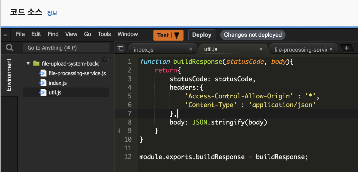 이제 Backendλ₯Ό λ‹΄λ‹Ήν•˜λŠ” λžŒλ‹€ ν•¨μˆ˜μ˜ ν•„μš”ν•œ μ½”λ“œλŠ” λͺ¨λ‘ μž‘μ„±ν•˜μ˜€μŠ΅λ‹ˆλ‹€. 이제 μ•„λž˜μ˜ κ·Έλ¦Ό 2와 같이, Deploy(배포) λ²„νŠΌμ„ λˆŒλŸ¬μ£Όμ„Έμš”.