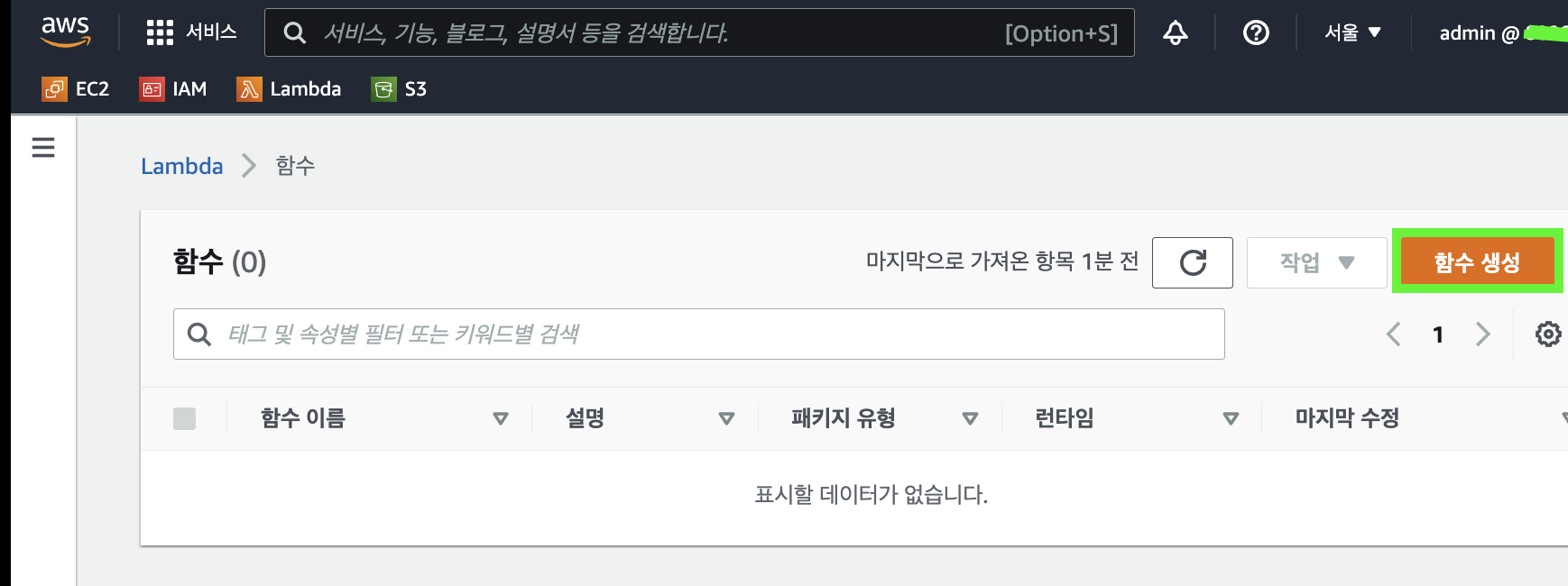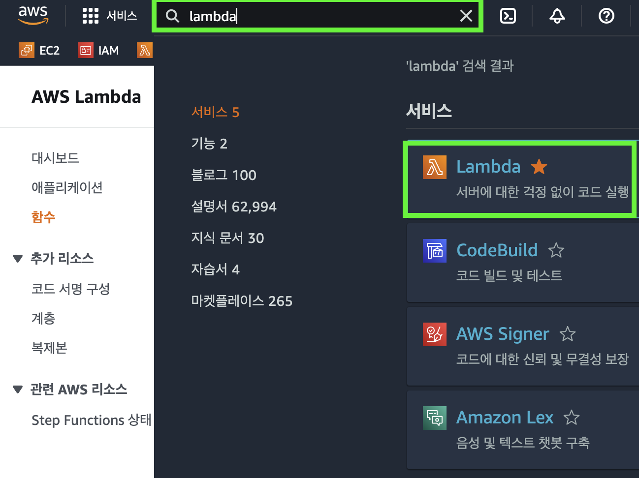 AWS ํํ์ด์ง ๊ฒ์์ฐฝ์์ Lambda๋ฅผ ๊ฒ์ํ์ฌ Lambda ์ฝ์๋ก ์ด๋ํฉ๋๋ค(๊ทธ๋ฆผ 11).