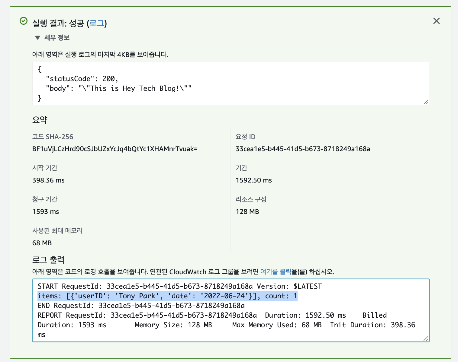 AWS Lambda๋ฅผ ํ์ฉํ DyanamoDB ํ ์ด๋ธ ๋ฐ์ดํฐ ์ฝ์ /์กฐํ ๋ฐฉ๋ฒ ๋ณธ๋ฌธ