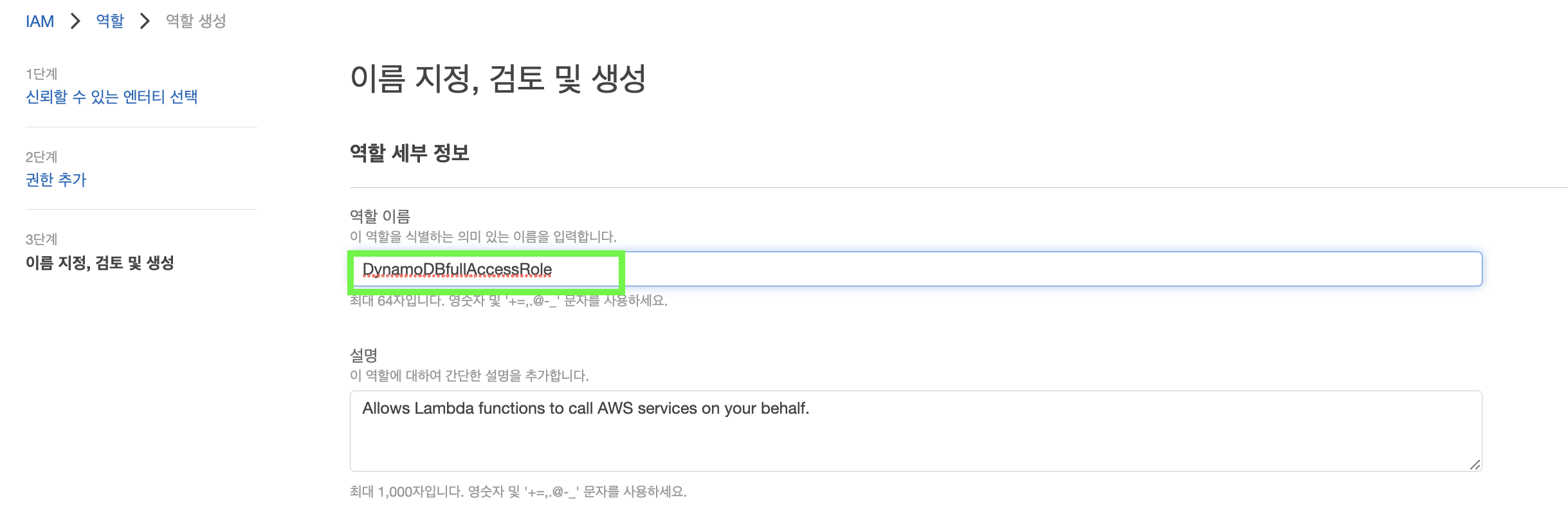 - ์คํ ์ญํ : "๊ธฐ์กด ์ญํ ์ฌ์ฉ" ์ ํ ํ ์์ ์์ฑํ IAM Role์ ์ ํ(DynamoDBfullAccess)