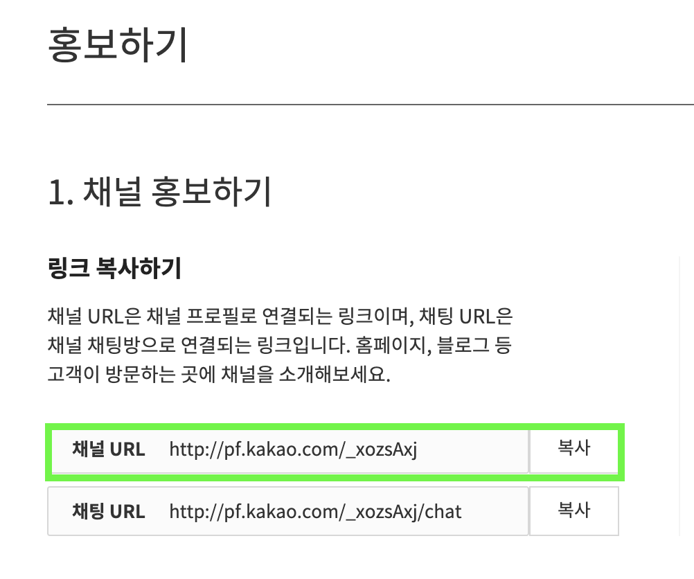 ๋ค์์ผ๋ก, ์นดํก ํ๋ฌ์ค์น๊ตฌ ID๋ฅผ ์ ๋ ฅํด์ผ ํฉ๋๋ค. ์์ ์์ฑํ๋ ์นดํก ํ์น ํ์ด์ง์์ ์ฌ์ด๋ ๋ฉ๋ด์ "ํ๋ณดํ๊ธฐ"๋ฅผ ํด๋ฆญํ์๋ฉด, ์๋์ ๊ทธ๋ฆผ 3์ฒ๋ผ ์ฑ๋ URL์ ํ์ธํ์ค ์ ์์ต๋๋ค. ์ด๋ฅผ ์์ ์ฝ๋ 14๋ฒ์งธ ๋ผ์ธ channelPublicId ๋ณ์์ ๋ณต๋ถ ํฉ๋๋ค.