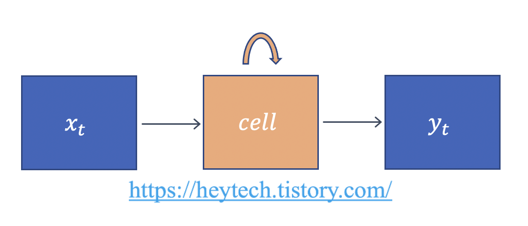 RNN을 도식화하면 위의 그림 1과 같습니다. \(x\)는 Input Layer의 입력 벡터, \(y\)는 Output Layer의 출력 벡터를 의미합니다. 편향(bias) \(b\)는 설명 편의상 생략하겠습니다. 여기서 셀(cell)은 Hidden Layer에서 Activation Function을 거쳐 결과를 내보내는 역할을 합니다. 또한, Cell은 이전 time step에서의 출력값을 기억하는 역할도 하므로 메모리 셀(Memory Cell) 또는 RNN Cell이라고도 부릅니다. 여기서 Cell이 값을 기억한다는 것은 이전 time step에서 Hidden Layer의 메모리 셀의 출력값을 자신의 입력값으로써 재귀적으로(recursively) 사용한다는 것을 의미합니다.