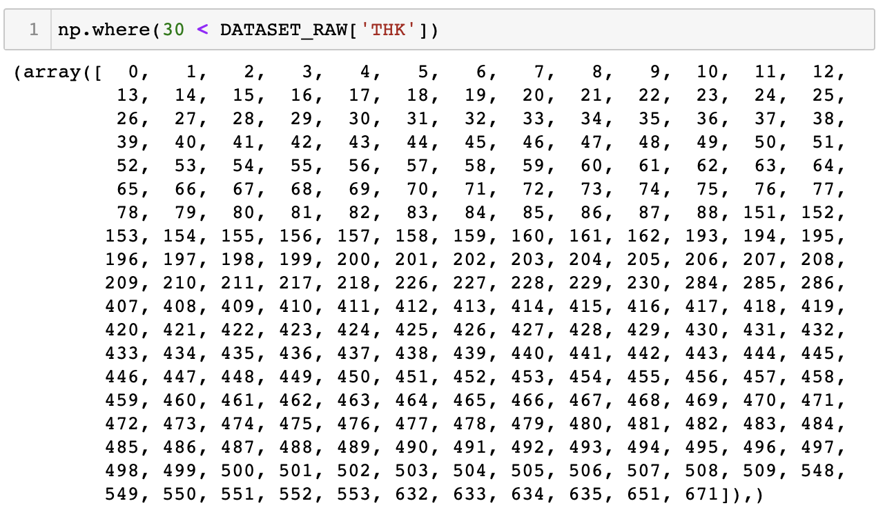 THK 칼럼 내 값이 30보다 큰 값의 인덱스를 조회해 보면 아래와 같습니다.