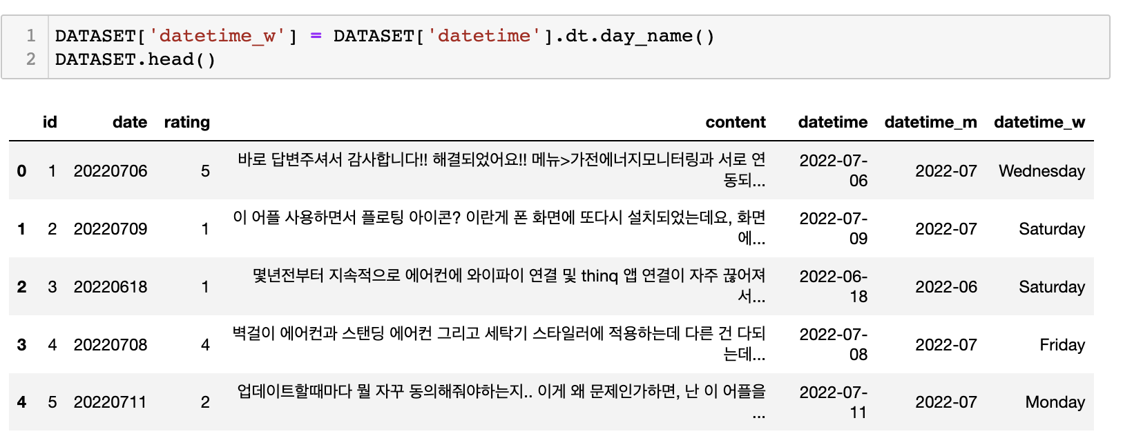 위와 같이 dt.day_name() 함수를 사용하면 요일 정보까지 얻을 수 있습니다(그림 3).
