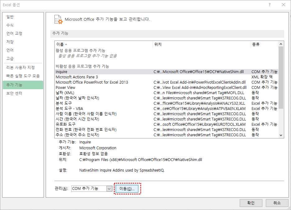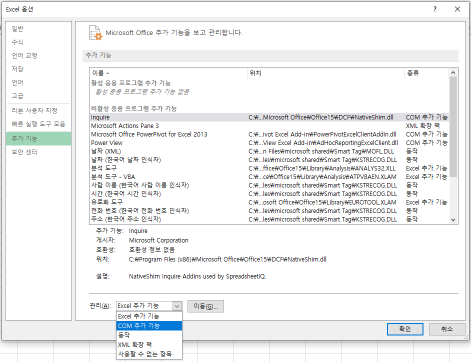 아래의 그림 7과 같이, '관리' 탭을 'COM 추가 기능'으로 선택합니다.