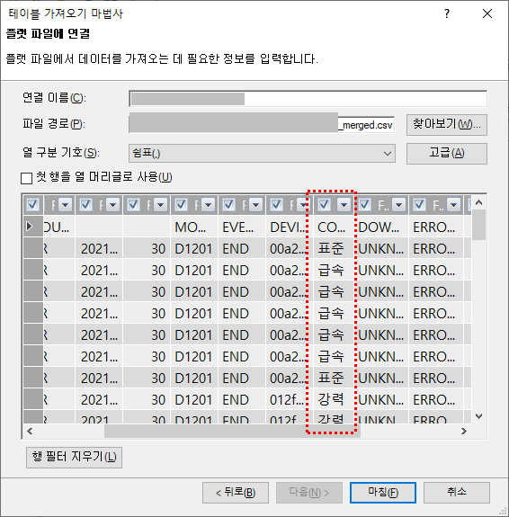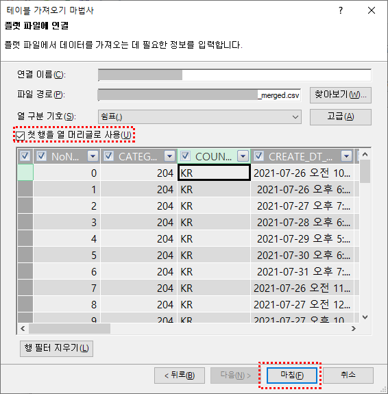 위의 그림 17을 보시면, 'F'로 시작되는 새로운 머리글이 생성되는 것을 확인할 수 있습니다. 기존 엑셀 파일의 첫 행을 머리글로 사용하기 위해서는 아래의 그림 18과 같이, '첫 행을 열 머리글로 사용'을 체크해 주셔야 합니다. 하단에 '마침' 버튼을 클릭합니다.