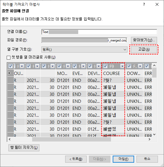 만약 아래의 그림 14와 같이, 한글이 깨져 나올 경우, 인코딩 방식을 변경하면 해결이 가능합니다. '고급' 버튼을 클릭해 주세요.