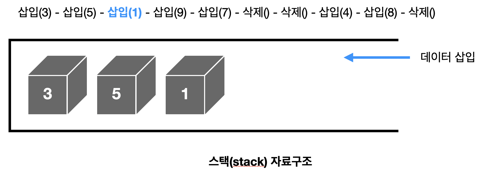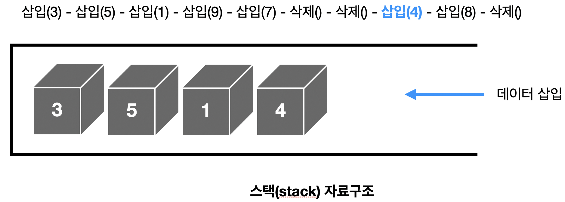그림 3 상단에 적힌 스택 자료구조 연산이 좌측에서 우측 순서대로 진행되는 예시를 살펴보겠습니다.