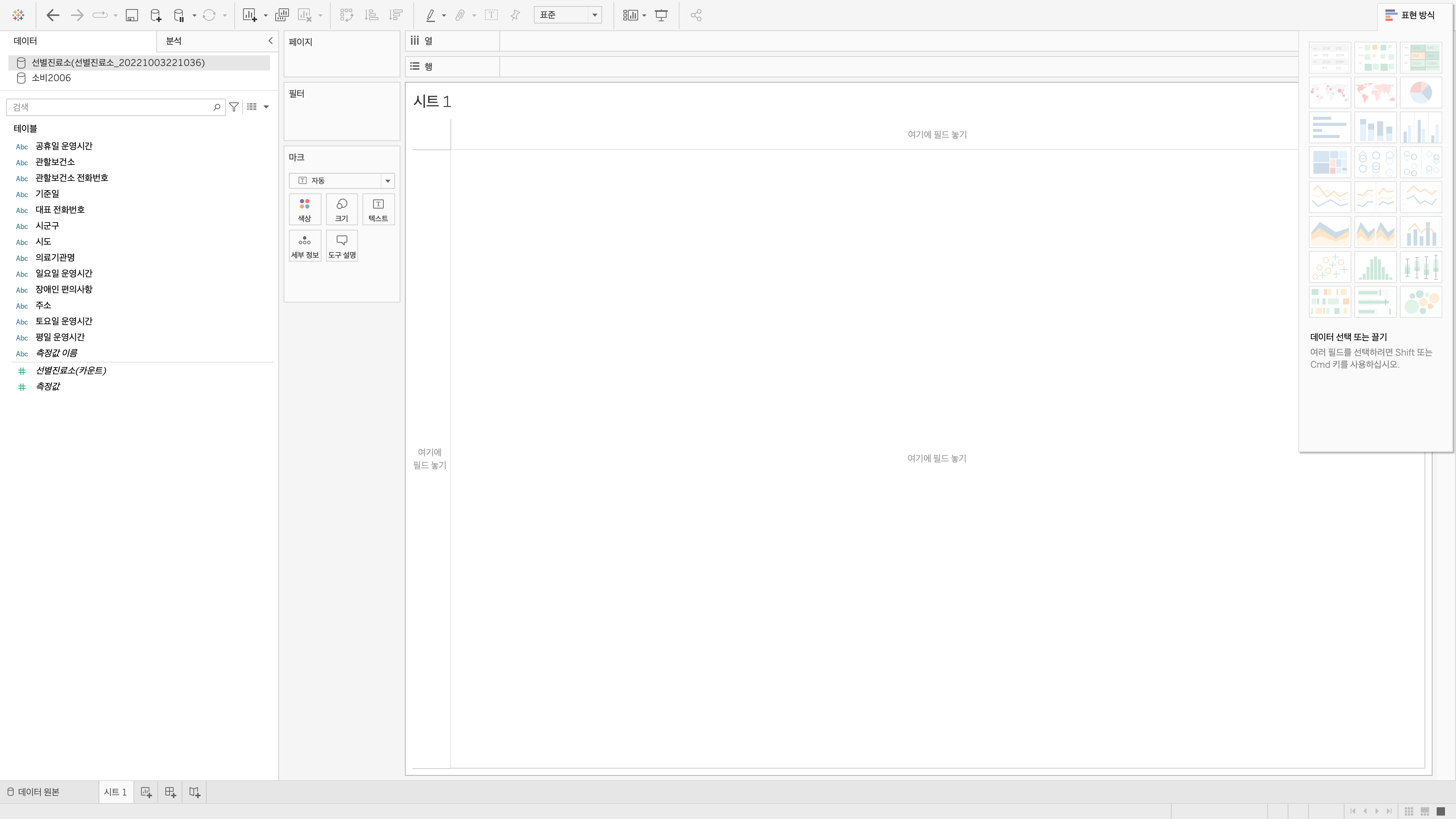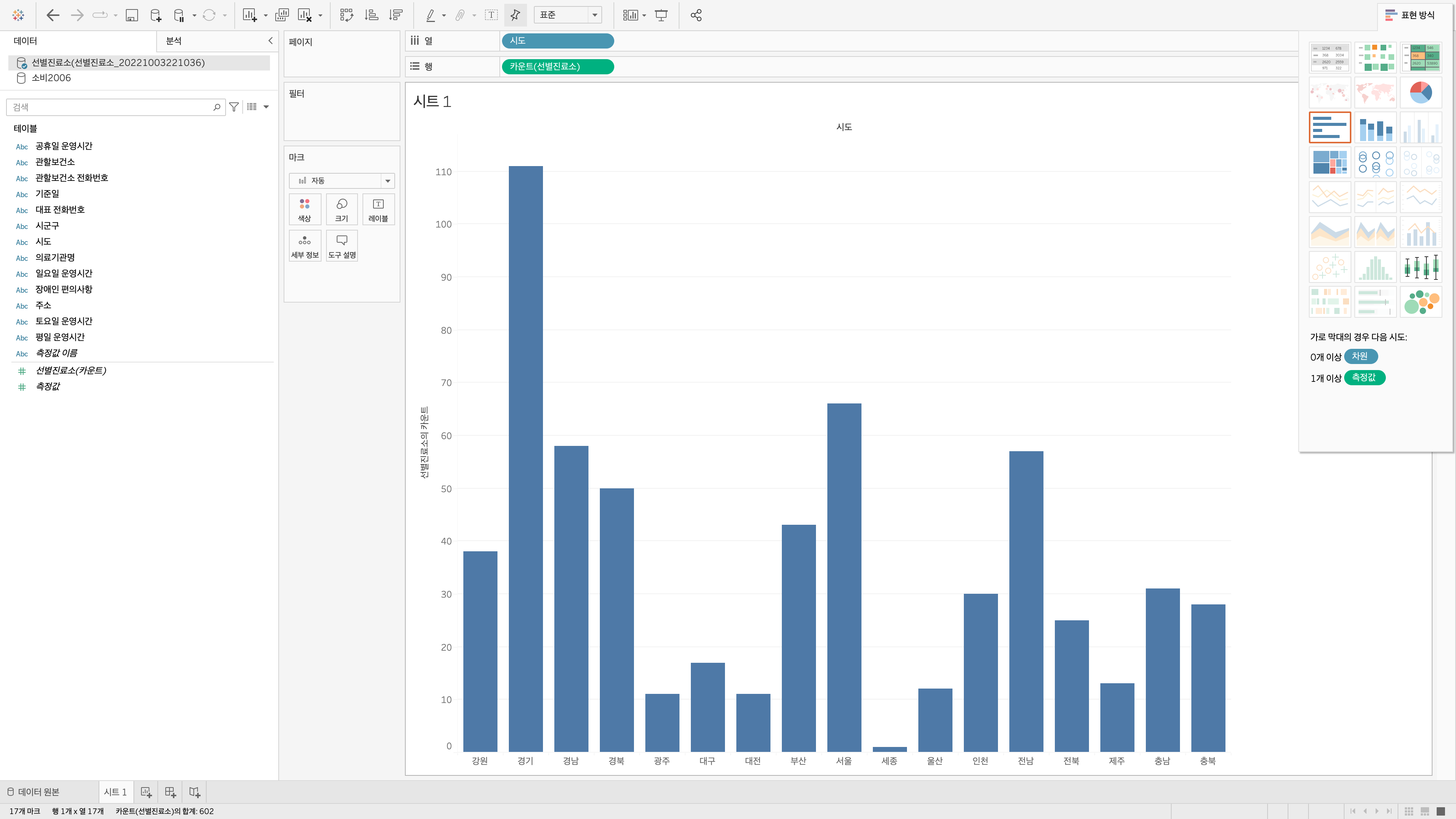 먼저, '시도' 차원을 더블 클릭하면 열에 맵핑됩니다.