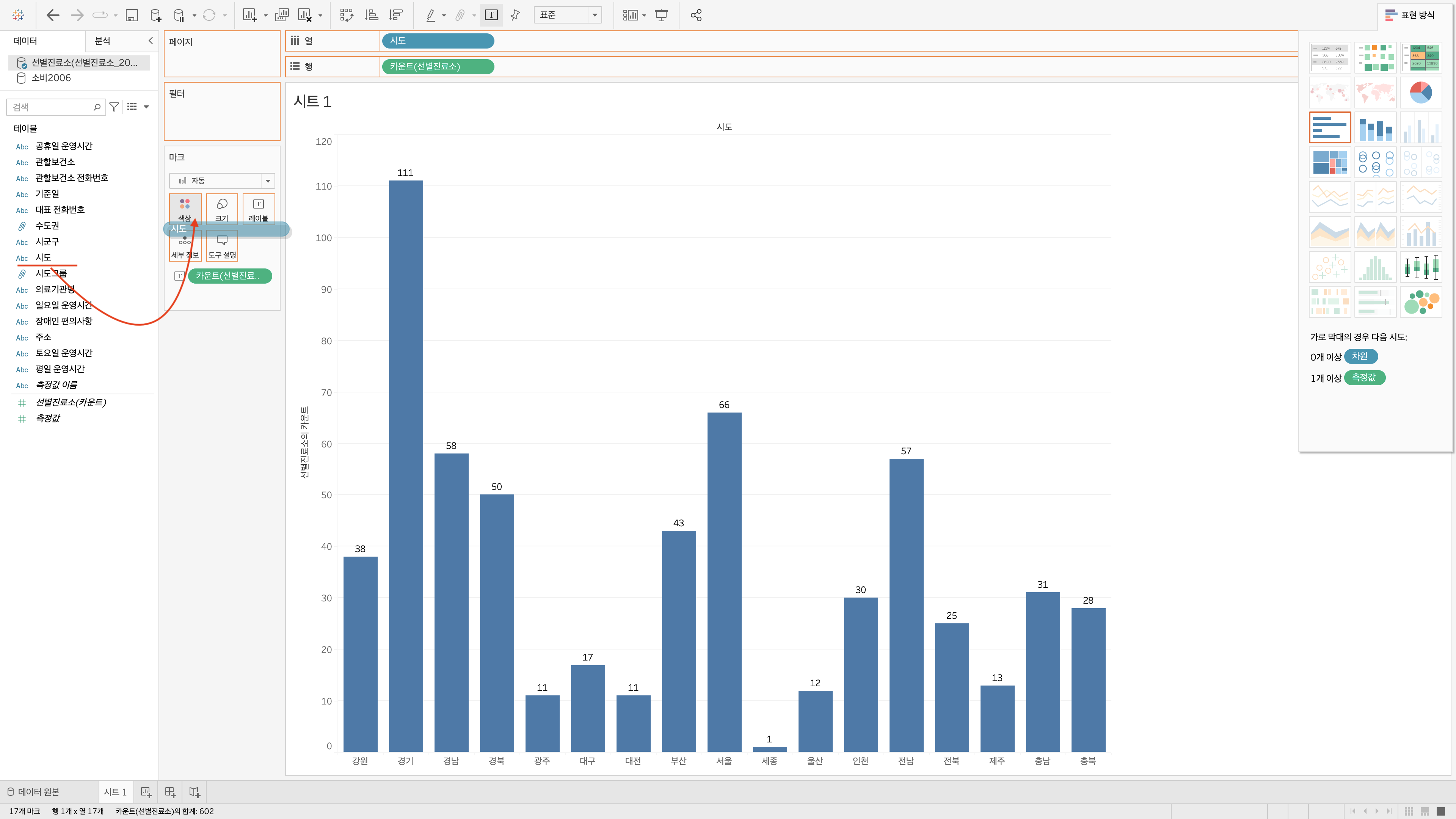 아래의 그림 6과 같이, 좌측에 '시도' 차원 필드를 드래그하시고, 바로 우측 '마크' 내 '색상'에 드롭합니다.