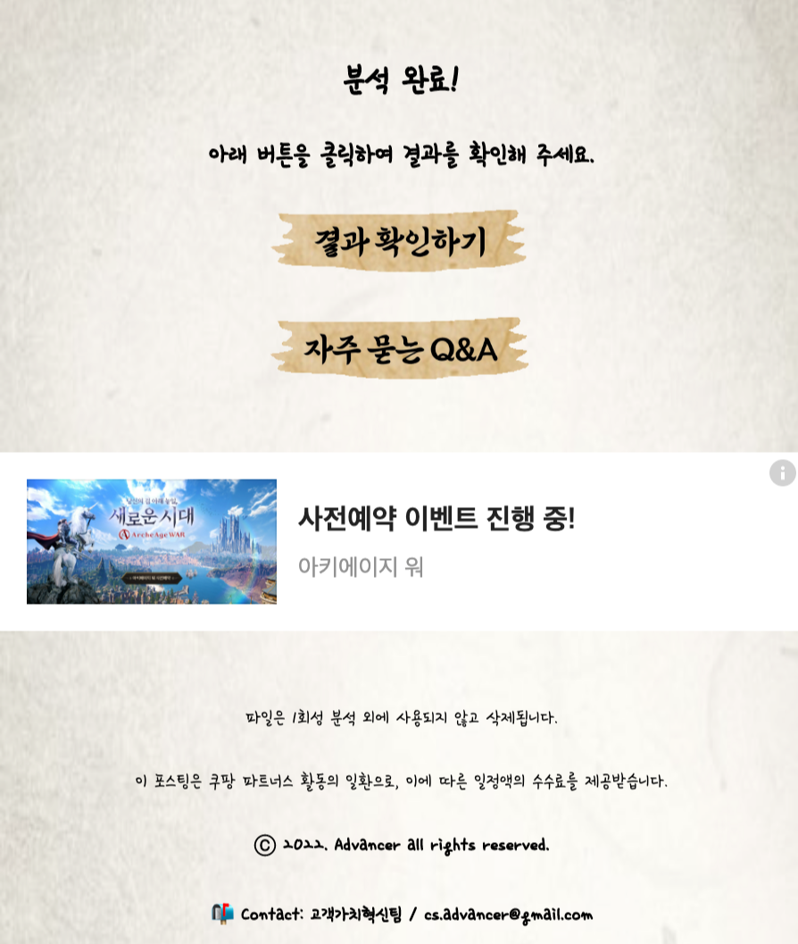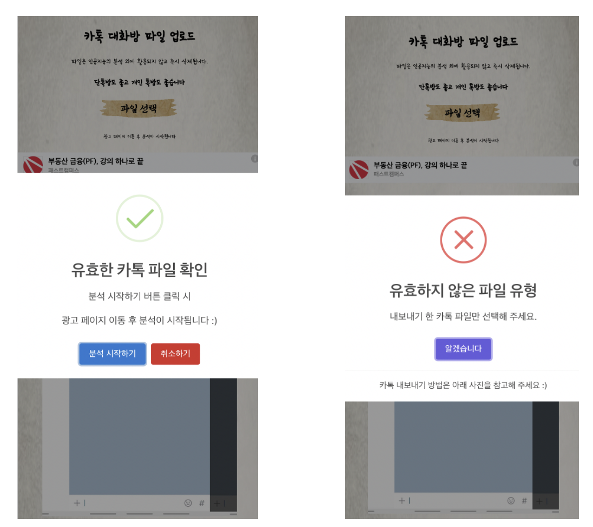 페이지 내 '파일 선택' 버튼 클릭 후 해당 파일을 업로드하면, 해당 파일이 카톡 대화내용인지 여부를 분석하고 결과를 팝업으로 안내합니다(그림 5 참고). 유요한 카톡 대화 내용 파일인 경우, '분석 시작하기' 버튼을 클릭하면, 본격적인 대화 내용 분석이 시작됩니다.