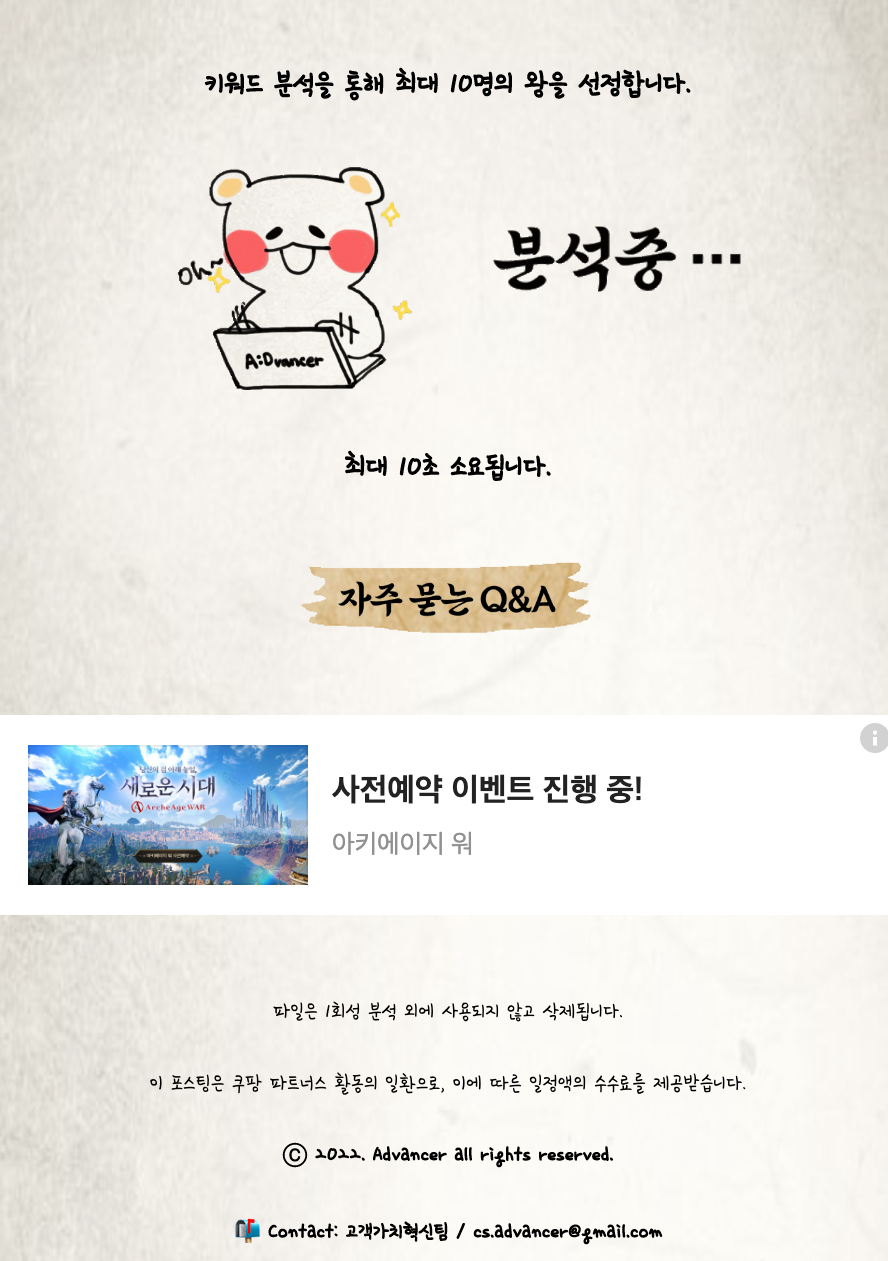 메인 페이지에는 서비스 Identity를 부각할 수 있는 이미지를 활용하였습니다(그림 2 참고). 대화 내용을 기반으로 대화방 구성원들이 어떤 왕인지 임명한다는 점에서, 조선왕조시대 느낌의 배경 이미지를 차용하였습니다. 버튼, 텍스트, 귀여운 캐릭터들은 모두 협업 디자이너가 작업하였습니다. 각 캐릭터는 하나의 왕을 의미합니다. 화면 중앙 부분에는 현재까지 몇 명의 사용자가 서비스를 이용했는지 카운팅하여 제공합니다. 하단에 '시작하기' 버튼을 누르면 카톡 파일 업로드 페이지로 이동합니다.