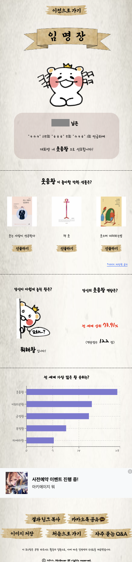 아래의 그림 10은 상세 결과 페이지인 왕 임명장입니다. 선정된 왕 관련 키워드별 사용횟수와 사용자 맞춤형 선물 추천 리스트를 제공합니다. '선물하기' 버튼을 누르면 해당 물품의 쿠팡 상품 페이지로 링크됩니다. 또한, 키워드 사용 점수가 2번째로 높았던 왕 유형인 '아쉽게 놓친 왕'과 전체 사용자 중 해당 왕에 임명된 사용자들의 키워드 스코어 대비 랭킹을 제공합니다. 마지막으로, 전체 사용자들이 임명된 왕 유형의 분포를 막대 차트로 제공합니다.