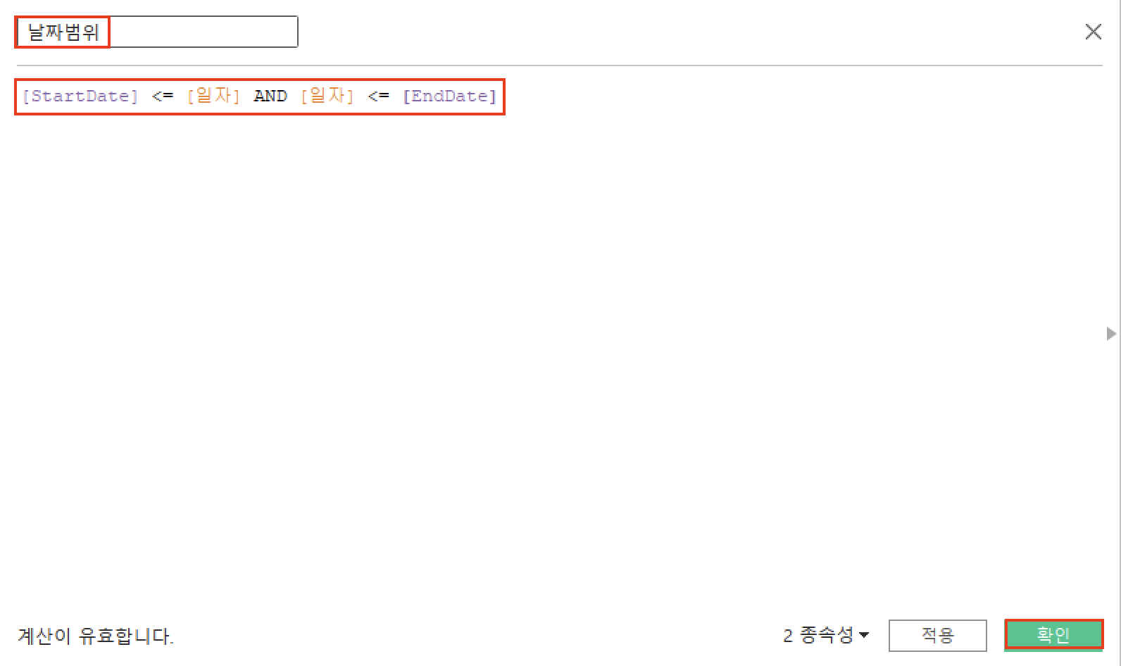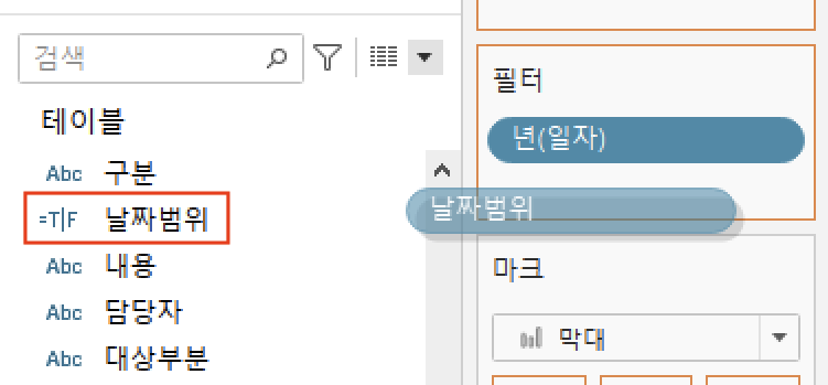 아래의 그림 9와 같이, 날짜 조회용 로직이 걸린 필드를 필터 선반에 드래그&드롭합니다.